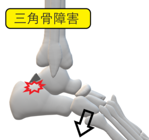 距骨後外側の過剰骨である三角骨が, 足関節の最大屈曲(底屈)時に脛骨遠位端部後縁と脛骨に挟まれる