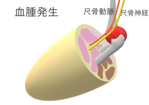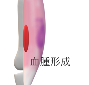 筋組織内、骨膜外等に貯留した血液で血腫が形成され、吸収されずに骨化する。