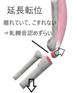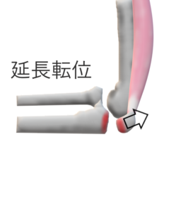 長骨の全長にわたって湾曲が変化するもので、受傷直後はⅩ線には映らない。