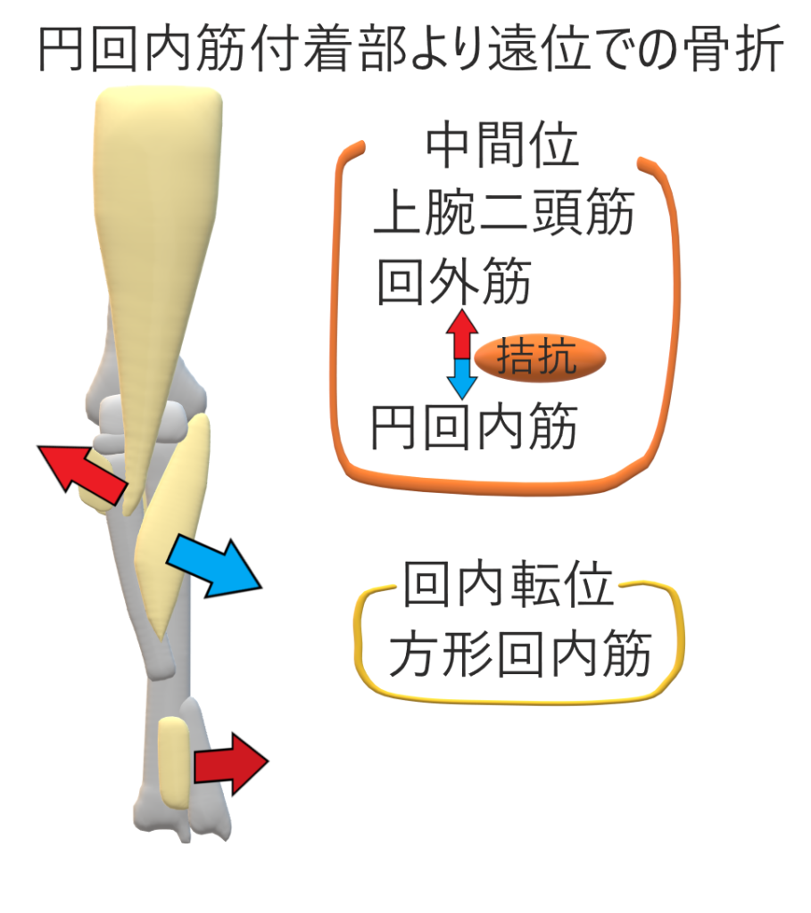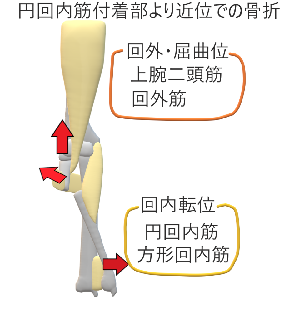 近位骨片:中間位(回外筋、上腕二頭筋と円回内筋の拮抗)