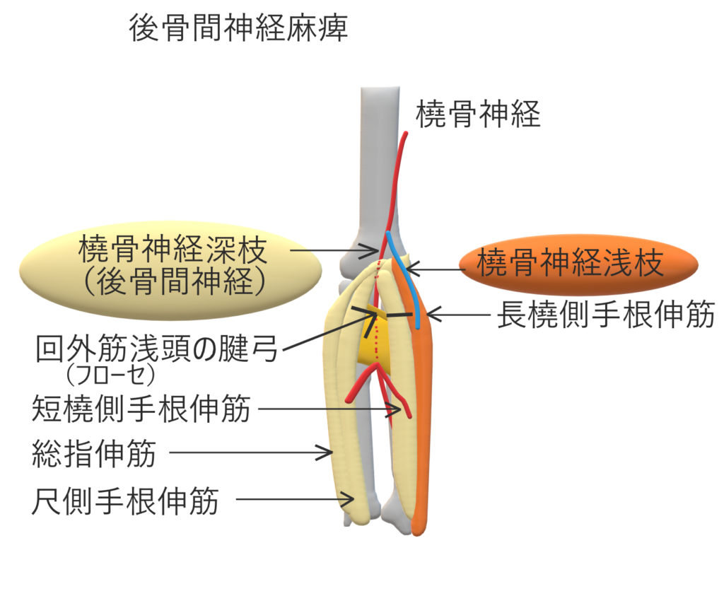 後骨間神経は短橈側手根伸筋、回外筋を支配しフローゼ腱弓を通り前腕伸筋に向かう