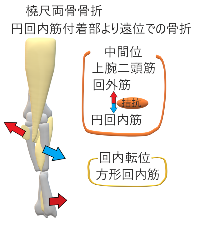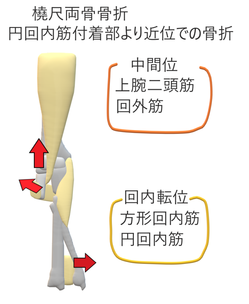 近位骨片:中間位(回外筋、上腕二頭筋と円回内筋の拮抗)