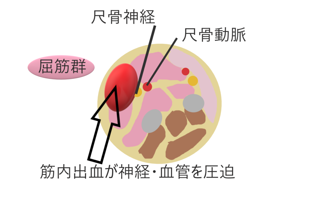 円回内筋症候群と同様、円回内筋、浅指屈筋起始部腱性アーチなどで絞扼される
