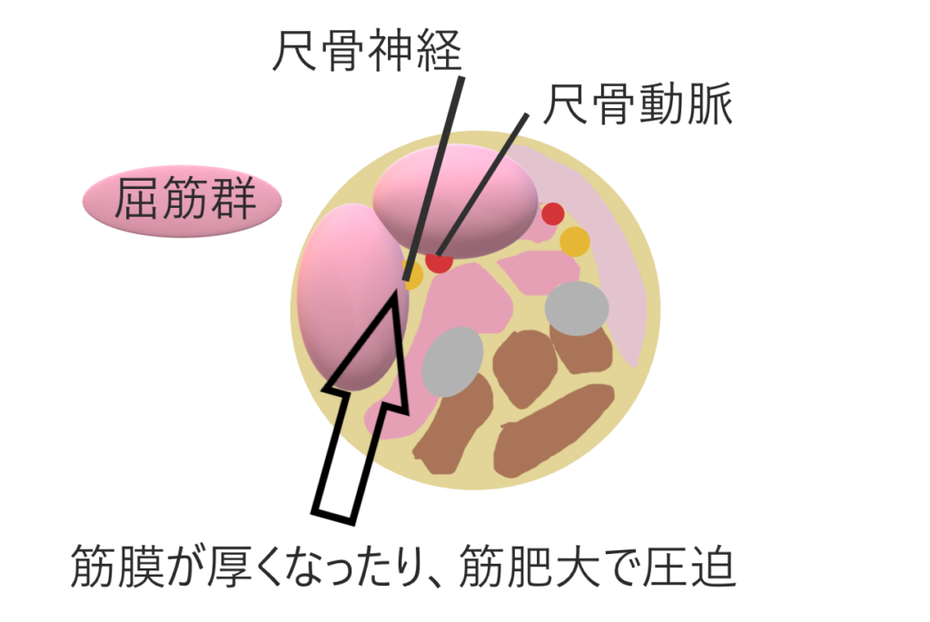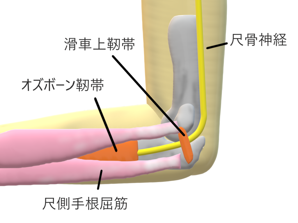 滑車上靭帯とオズボーン靭帯で形成されるトンネルで尺骨神経が絞扼されて発症