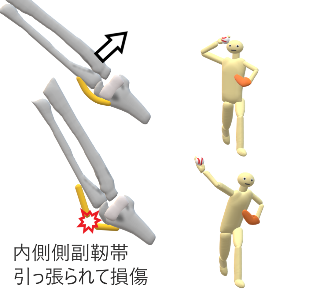 コッキング期から加速期にかけての肘外反力で前腕回内屈筋群が強く収縮し、MCLにより強い引っ張りストレスで発生。多くは内側型