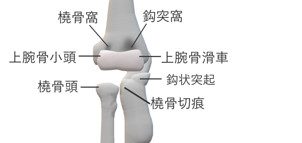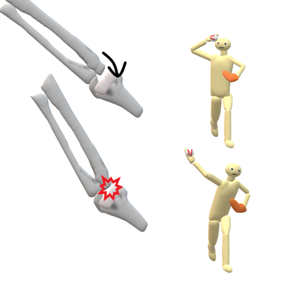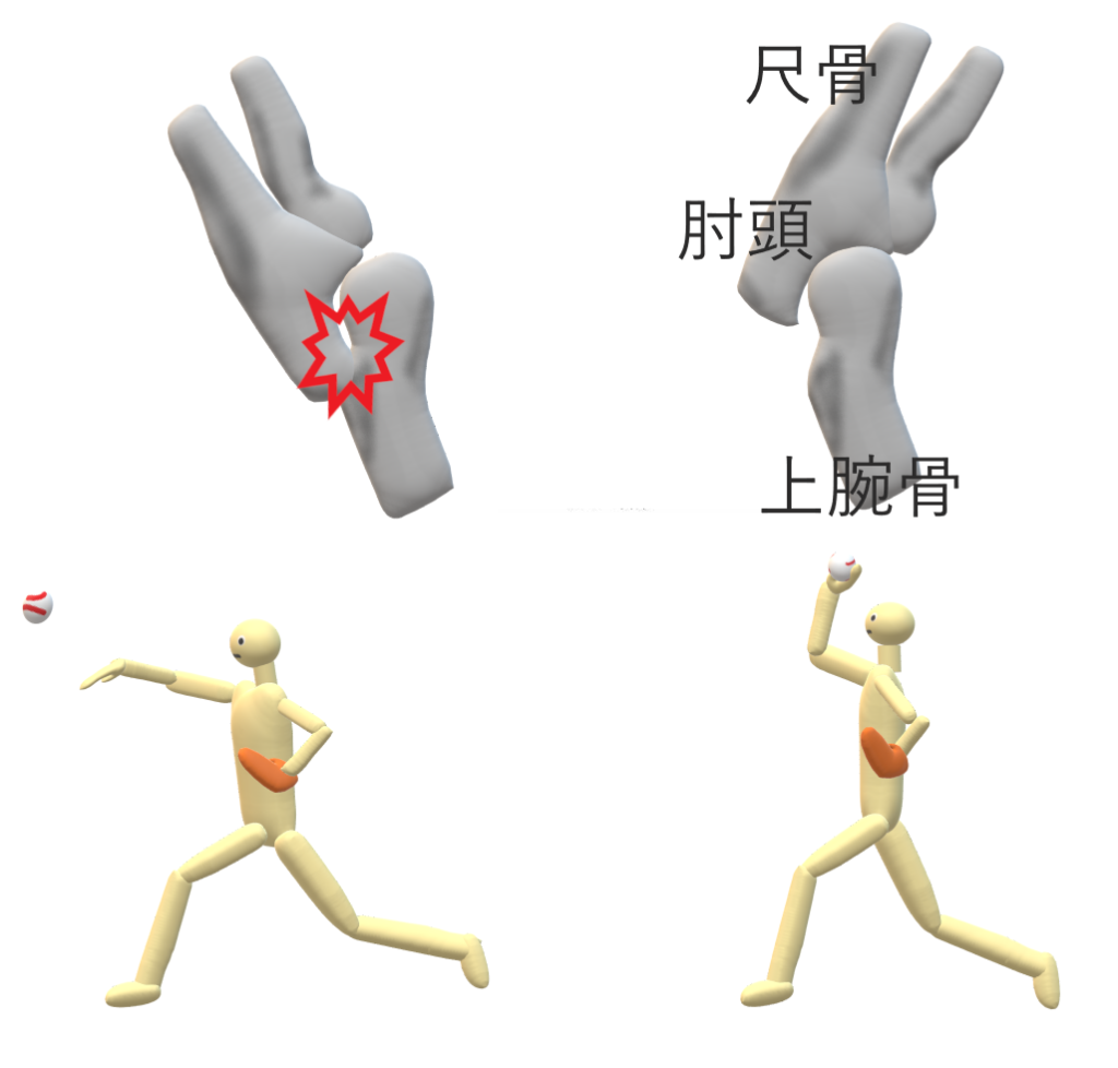 加速期からフォロースルー期にかけて肘に強い外反力がかかり上腕骨小頭と橈骨頭で圧迫力が加わる