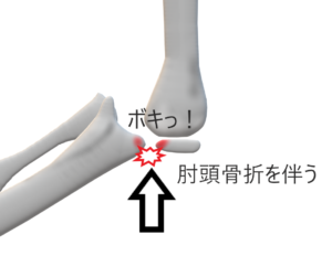 ・後方からの強い衝撃で過伸展。肘頭の上縁が肘頭窩の情報に衝突⇒上腕骨遠位端部が前方