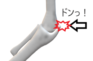 肘屈曲位で後方からの外力、前腕部に直達外力