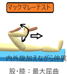➀マックマレーテスト:股・膝最大屈曲で内外旋力を加えて下肢伸展