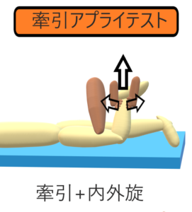 膝で大腿部を固定しながら牽引しつつ内旋外旋を加える