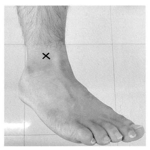 問題 121 20歳の男性。 柔道の乱取り中 右足部外返しで踏ん張った際、 足関 節部の疼痛を自覚し来所した。 圧痛部 (別冊 No.5)を別に示す。 足関節を他動的に背屈、外旋させると疼痛が増強した。