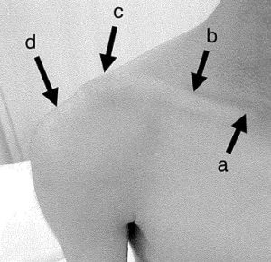 問題110 65歳の女性。 足を滑らせ右肩関節外転・伸展で手を衝き負傷した。来所時、右肩関節が水平位で弾発性固定し上腕は短縮して見えた。 考えられるのはどれか。