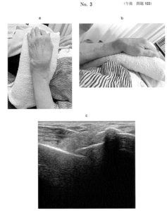 問題 114 30歳の男性。 職業はプログラマーである。 10日程前から前腕外側に 腫脹と圧痛を自覚して来所した。 来所時、 母指を自動運動させると痛みが増強し握雪音が聴取できた。考えられるのはどれか。