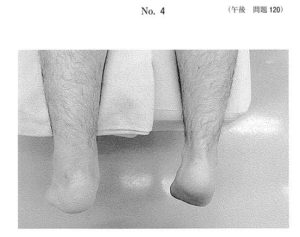 問題 120 45歳の男性。 フットサル中、 左下腿下部後面に蹴られたような痛みを自覚し、翌日来所した。 来所時の写真 (別冊No.4) を別に示す。本人の希望によって保存的に施術することにした。